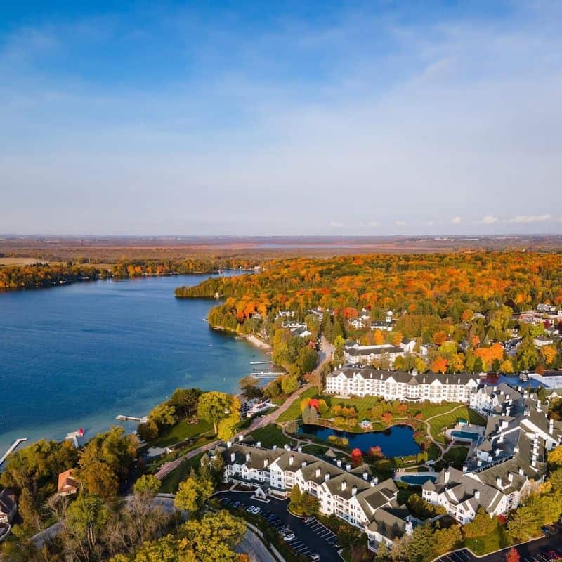 Racing heritage meets lakeside tranquility in this central Wisconsin gem. Crystal-clear spring-fed waters invite couples to paddle together in vintage wooden boats or swim to the floating platform for private sunbathing. The Osthoff Resort offers lakefront suites with fireplaces and whirlpool tubs—perfect after a couples cooking class at their L’ecole de la Maison cooking school.
