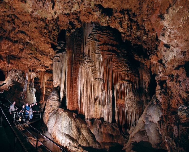 Stalactites and stalagmites create cathedral-like chambers beneath the Ozark hills in this spectacular cave system. Once a hideout for Jesse James, these caverns now welcome visitors with guided tours showcasing dramatic formations illuminated by colorful lights.