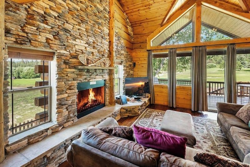 The stone fireplace dominates the living area, inviting guests to gather around its warmth after a day of outdoor adventures. Summer brings different magic – wildflowers dot the surrounding meadows and clear night skies reveal more stars than you thought possible.