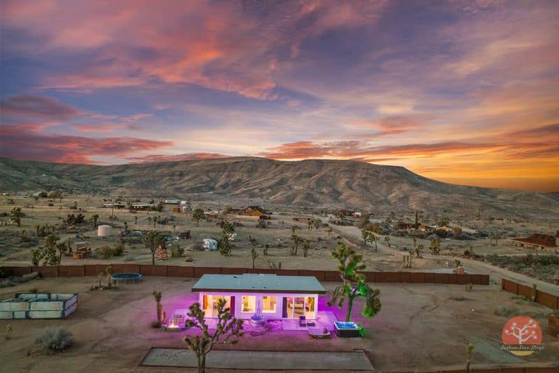 Otherworldly silence envelops this minimalist desert retreat. The stark beauty of twisted Joshua trees creates nature’s sculpture garden around the property, their silhouettes dramatic against the vast sky.