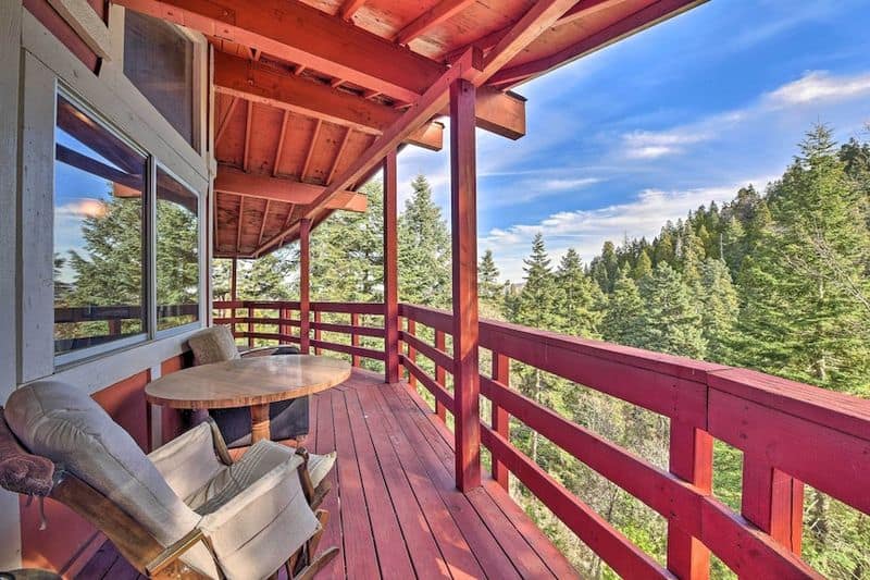The spacious deck offers panoramic views of pine-covered mountains that seem to stretch forever.