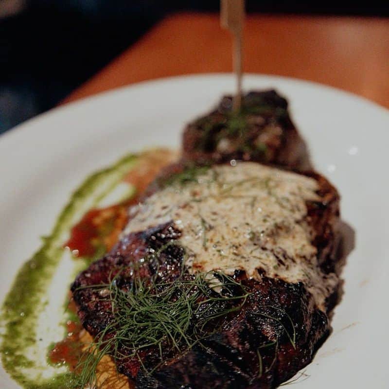 Housed in a converted 1920s warehouse, Rusty Moose boasts exposed brick walls and original timber beams that create a rustic-industrial atmosphere. Their specialty is the 32-ounce tomahawk steak, dramatically presented on a wooden board with roasted bone marrow butter melting over the top.
