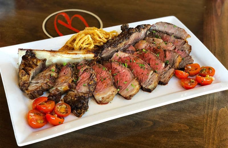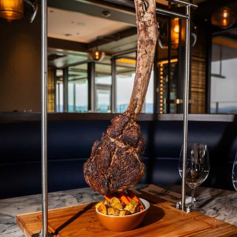 During winter months, the heated outdoor fire pit area becomes a cozy spot to enjoy their signature 45-day dry-aged tomahawk steak for two, dramatically presented still smoking from the cedar plank.