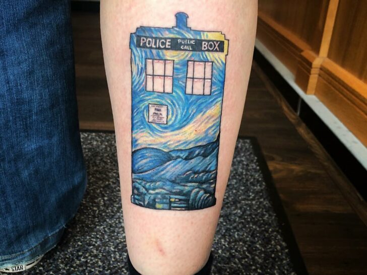 This circle tattoo features the iconic “Starry Night”, Van Gogh’s famous oil painting and a renowned masterpiece of post-impressionism.