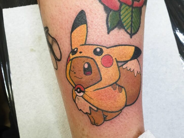 This tattoo features Disney’s most iconic character, Mickey Mouse, the beloved face of The Walt Disney Company. The design showcases Mickey’s outline in delicate black swirly lines, with his signature black ears, red shorts, and yellow shoes vividly colored inside.
