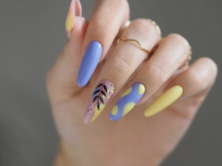 Embrace the seasonal shift with this manicure in muted hues of teal, lavender, and pink. Each nail flaunts a unique design—flowers, smoky patterns, dots, and snake-like skin—creating a cohesive yet eclectic look that perfectly bridges the gap between seasons!