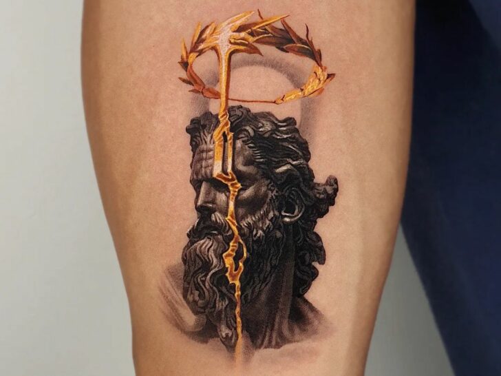 This stunning graphic tattoo captivates with its intricate details, blending scenes like the fall of Phaeton and Michelangelo’s Creation of Adam with a range of geometric shapes and lines.