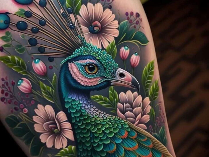This example looks like a traditional tattoo. The red ink is amazingly applied to the skin, but the surrounding flowers are what remind you of traditional tattoos. The combination of colors creates a great contrast in this design.