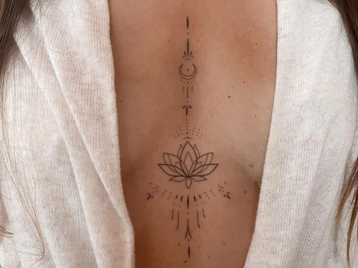 Placed delicately at the center of the chest, this spider lily tattoo can be either intimate and eye-catching, depending on your outfit.